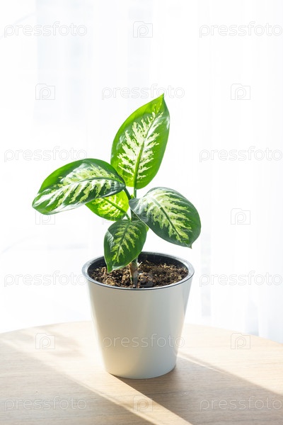 Крупный план Dieffenbachia Tropic Snow в интерьере на круглом столе в горшке на белом фоне окна с занавеской. комнатное растение Выращивание и уход за комнатным растением, зеленый дом. минимализм
