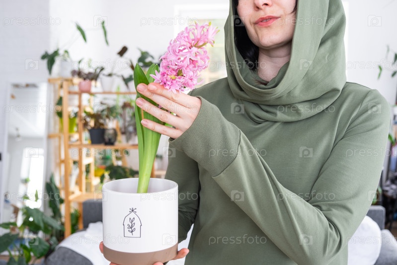 Весенний цветочный гиацинт расцвел дома в горшке в руках женщины в интерьере теплицы со стеллажами из коллекций домашних растений. Домашнее растениеводство