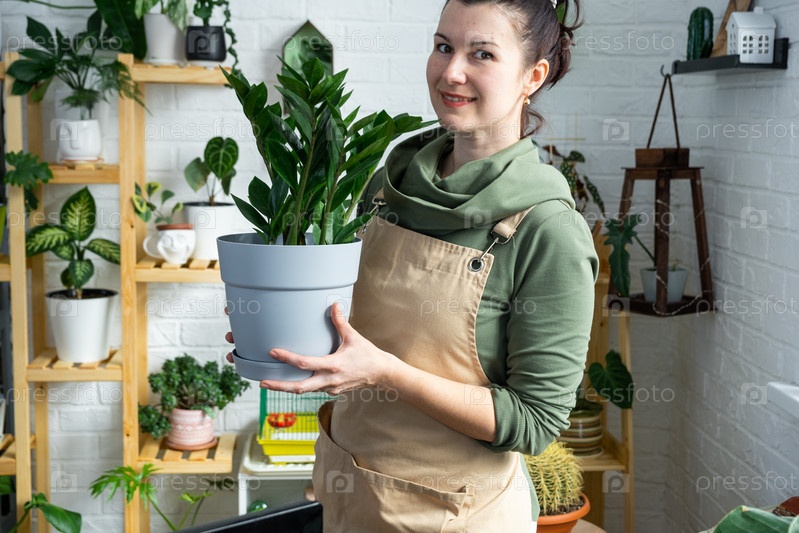 Неприхотливый и популярный замиокулькас в руках женщины в интерьере оранжереи со стеллажами из коллекций домашних растений. Домашнее растениеводство