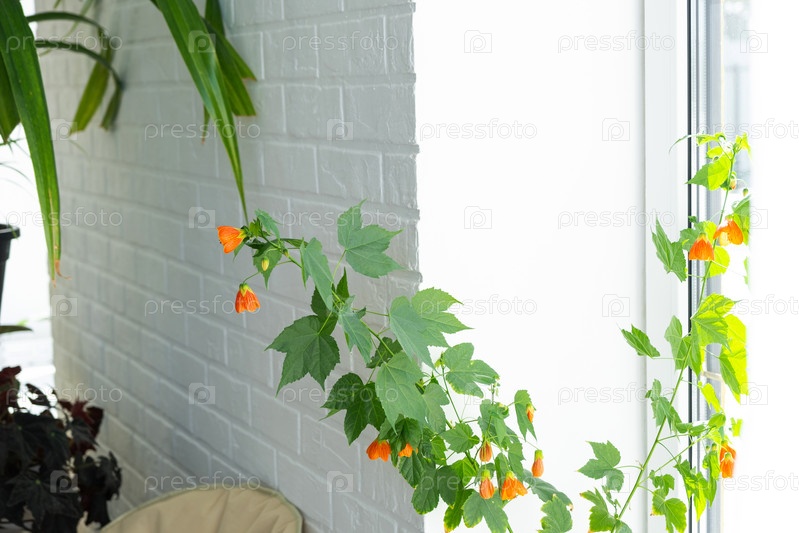Цветущий оранжевый колокольчик Абутилон крупным планом, веревочная ягода из семейства Мальвовых. Уход и выращивание домашних растений на подоконнике