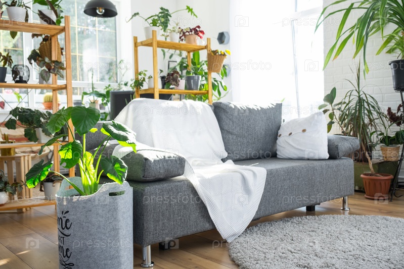 Стеллаж с группой комнатных растений в интерьере комнаты белый лофт, серый диван, уютный плед, ковер. Комнатное растение Выращивание и уход за комнатным растением, зеленый дом