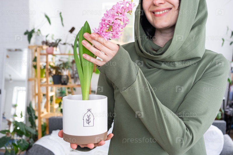 Весенний цветочный гиацинт расцвел дома в горшке в руках женщины в интерьере теплицы со стеллажами из коллекций домашних растений. Домашнее растениеводство
