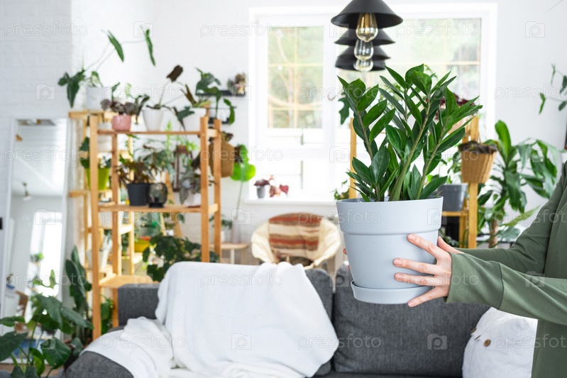 Неприхотливый и популярный замиокулькас в руках женщины в интерьере оранжереи со стеллажами из коллекций домашних растений. Домашнее растениеводство