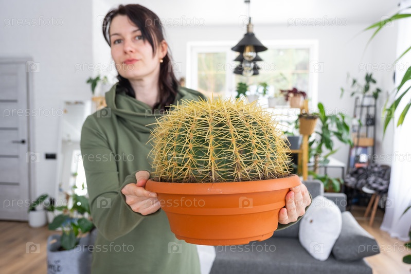 Большой эхинокактус Грузони в руках женщины в интерьере оранжереи со стеллажными коллекциями домашних растений. Домашнее растениеводство, селекционер любуется кактусом в горшке