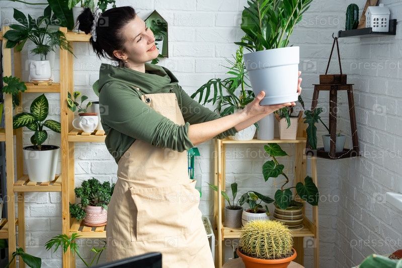 Неприхотливый и популярный замиокулькас в руках женщины в интерьере оранжереи со стеллажами из коллекций домашних растений. Домашнее растениеводство