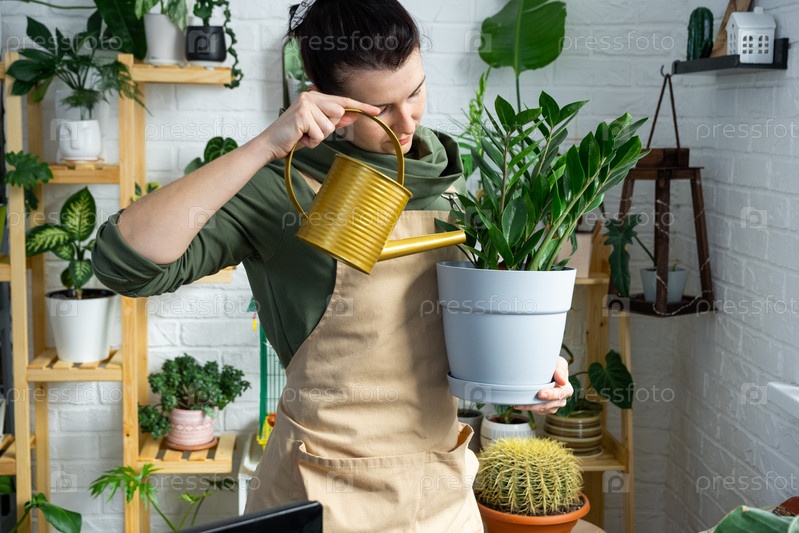 Женщина поливает домашние растения из своей коллекции редких видов из лейки, с любовью выращенной на полках в интерьере дома. Домашнее растениеводство, теплица, водный баланс