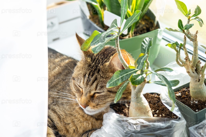 Кошка спит на подоконнике с группой комнатных растений адениума. Голова кота лежит на горшке с цветком, растениями и домашними животными