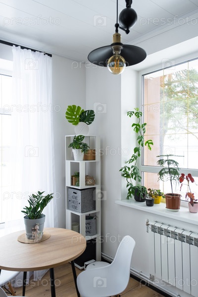 Интерьер дома с большими окнами и домашними растениями, круглый стол, стулья, белый лофт. Комнатное растение уход за комнатным растением, зеленый дом