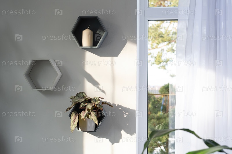 Полки на стене в виде сот с комнатными растениями в белом интерьере дома. Современный декор Комнатное растение уход за комнатным растением, зеленый дом