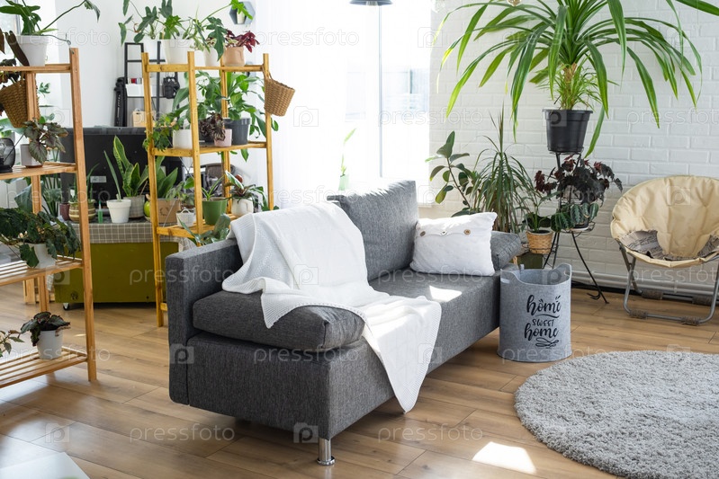Стеллаж с группой комнатных растений в интерьере комнаты белый лофт, серый диван, уютный плед, ковер. Комнатное растение Выращивание и уход за комнатным растением, зеленый дом