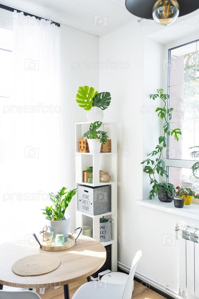 Интерьер дома с большими окнами с планировкой и домашними растениями с лозой монстера минима на склоне. Комнатное растение уход за комнатным растением, зеленый дом