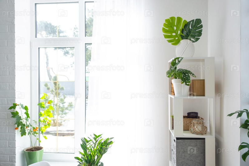 Интерьер дома с большими окнами с планировкой и домашними растениями с лозой монстера минима на склоне. Комнатное растение уход за комнатным растением, зеленый дом