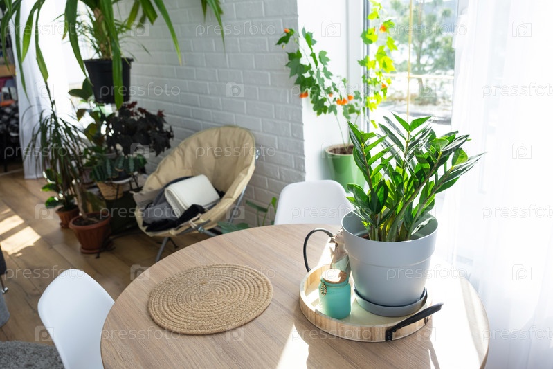 Интерьер дома с большими окнами и домашними растениями, круглый стол, стулья, белый лофт. Комнатное растение уход за комнатным растением, зеленый дом