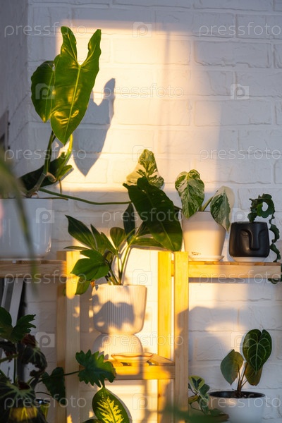 Стеллаж с группой комнатных растений в интерьере в вечернем свете солнца и бликах на стене. Комнатное растение Выращивание и уход за комнатным растением, зеленый дом