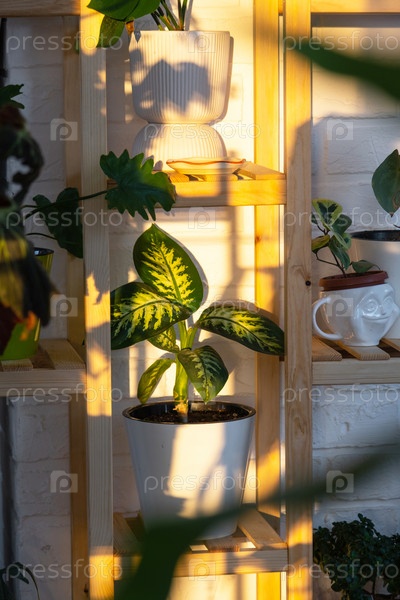 Стеллаж с группой комнатных растений в интерьере в вечернем свете солнца и бликах на стене. Комнатное растение Выращивание и уход за комнатным растением, зеленый дом