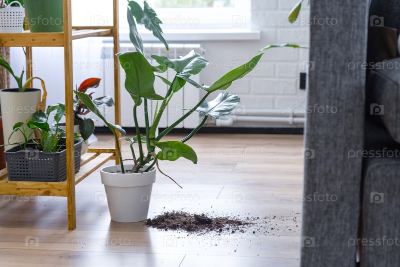 Комнатное растение упало на пол, а почва из горшка осыпалась, мусор, грязь и беспорядок из-за падения кашпо со стойки. Уход и чистка полок в интерьере теплицы