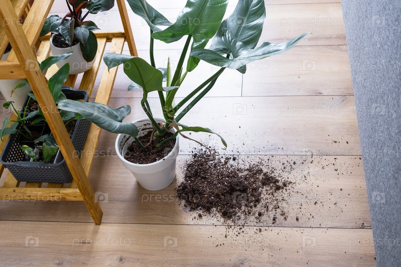 Комнатное растение упало на пол, а почва из горшка осыпалась, мусор, грязь и беспорядок из-за падения кашпо со стойки. Уход и чистка полок в интерьере теплицы