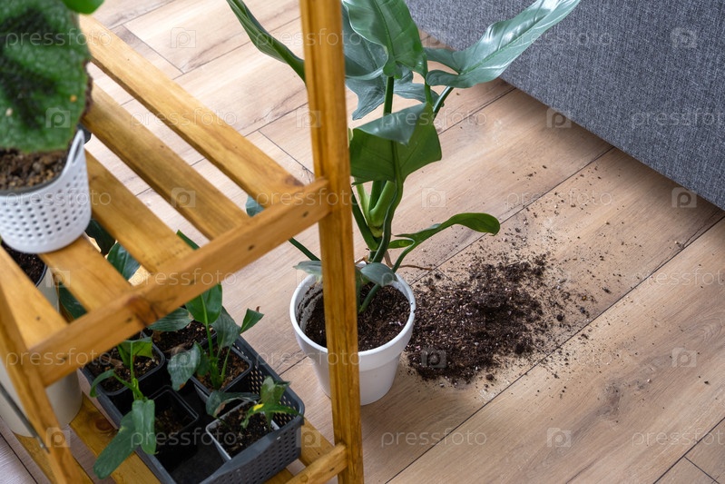 Комнатное растение упало на пол, а почва из горшка осыпалась, мусор, грязь и беспорядок из-за падения кашпо со стойки. Уход и чистка полок в интерьере теплицы