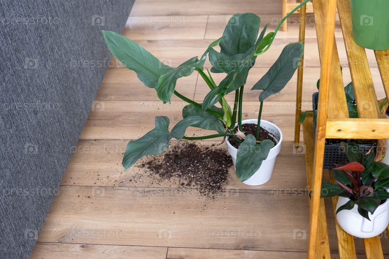 Комнатное растение упало на пол, а почва из горшка осыпалась, мусор, грязь и беспорядок из-за падения кашпо со стойки. Уход и чистка полок в интерьере теплицы