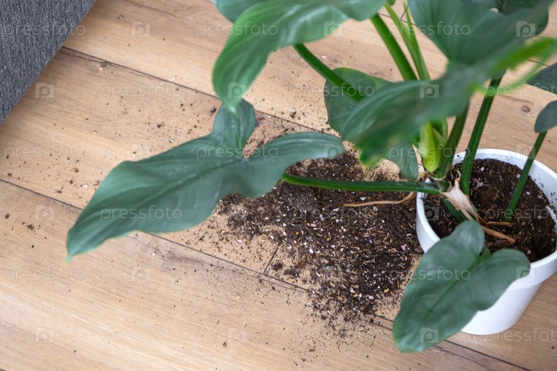 Комнатное растение упало на пол, а почва из горшка осыпалась, мусор, грязь и беспорядок из-за падения кашпо со стойки. Уход и чистка полок в интерьере теплицы