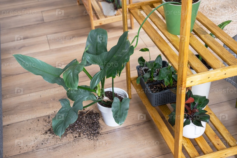 Комнатное растение упало на пол, а почва из горшка осыпалась, мусор, грязь и беспорядок из-за падения кашпо со стойки. Уход и чистка полок в интерьере теплицы