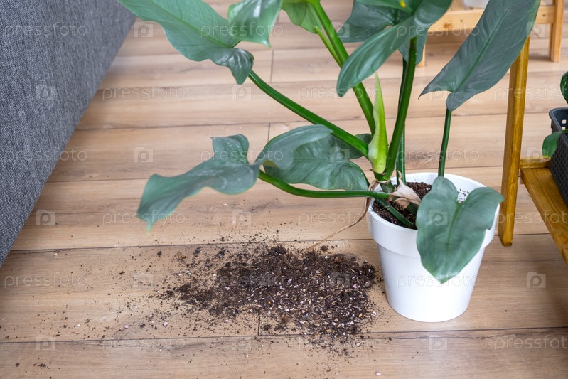Комнатное растение упало на пол, а почва из горшка осыпалась, мусор, грязь и беспорядок из-за падения кашпо со стойки. Уход и чистка полок в интерьере теплицы