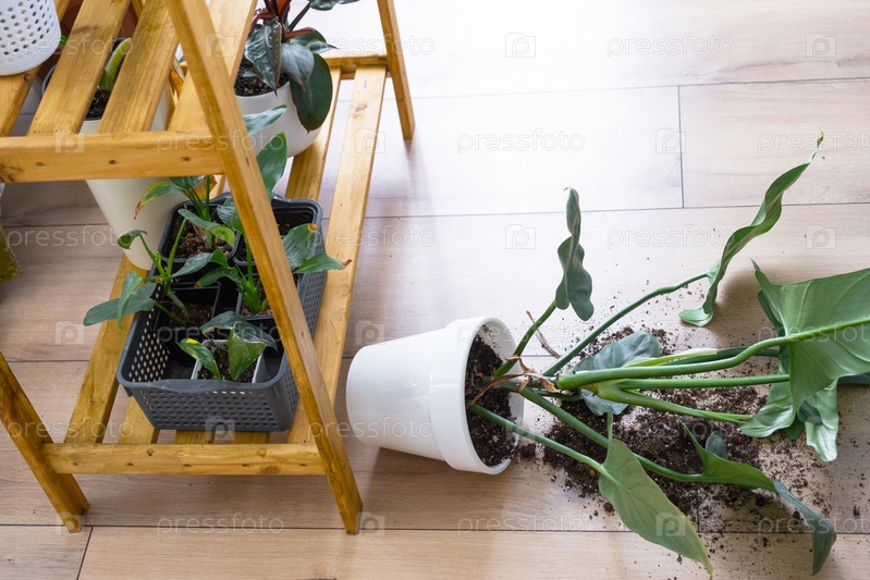 Комнатное растение упало на пол, а почва из горшка осыпалась, мусор, грязь и беспорядок из-за падения кашпо со стойки. Уход и чистка полок в интерьере теплицы
