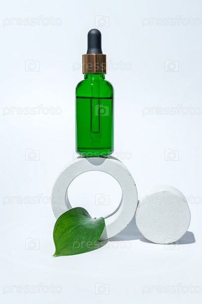 Зеленая стеклянная косметическая бутылка с капельницей на белом фоне с круглым лепестком и тропическими листьями. Концепция натуральной косметики, натуральные эфирные масла и средства по уходу за кожей