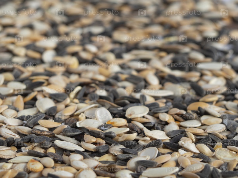 Натуральный пищевой фон из смеси семян подсолнечника и тыквы, малая глубина резкости