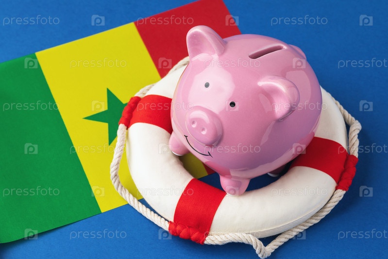 Копилка, спасательный круг и флаг на синем фоне, концепция на тему спасения экономики Сенегала