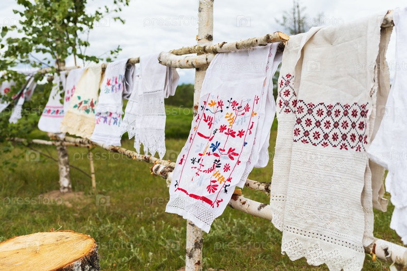 Винтажные русские полотенца на деревянном заборе на открытом воздухе