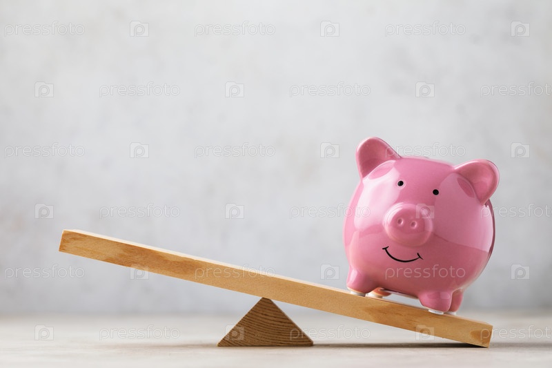 Керамическая копилка на деревянных качелях или весах на абстрактном фоне, бизнес-концепция, шаблон для дизайнера