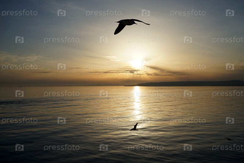 Морской пейзаж с чайкой над Керченским проливом. Россия
