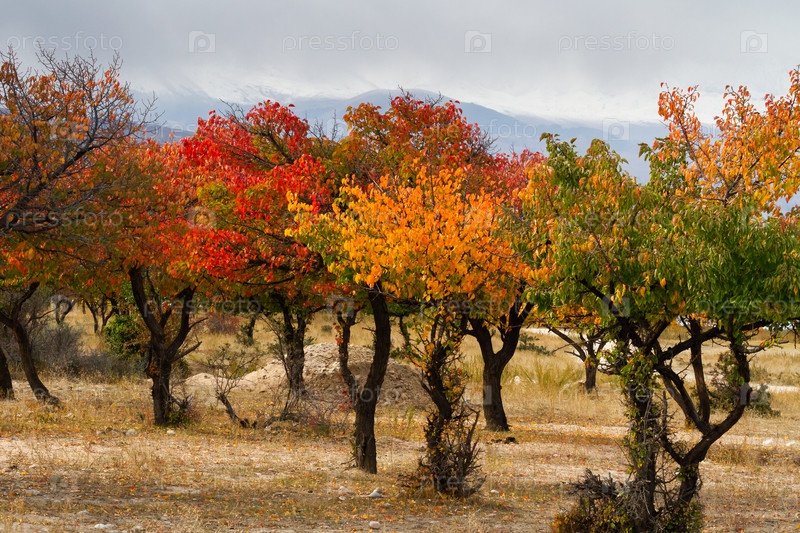 Абрикосовый сад с красочными желтыми, оранжевыми и красными листьями осенью