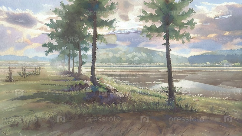 Акварель летний пейзаж