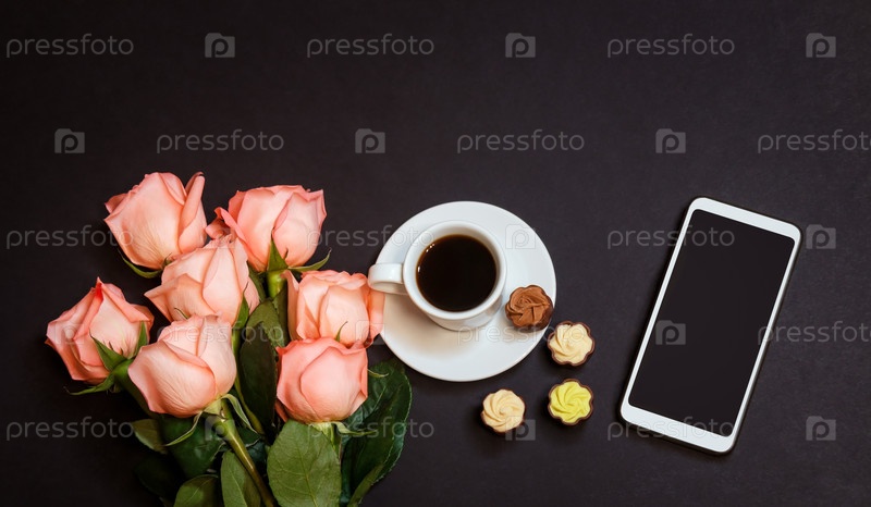 Розовые розы, чашка кофе, смартфон и шоколадные конфеты на темном фоне