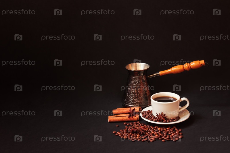Кофейная чашка, турка, специи и кофейные зерна на темном фоне