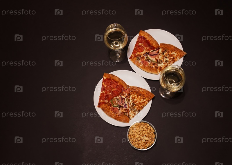 Кусочки пиццы пепперони, пиццы с ветчиной и куриной пиццы, бокалы белого вина и арахис на темном фоне