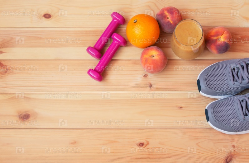 Домашний коктейль из здоровых фруктов из апельсинов, персиков и бананов, двух розовых гантелей, кроссовок, персиков и апельсинов на деревянном фоне. Вид сверху, пространство для копирования