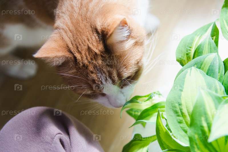 Рыжий кот нюхает зеленое растение