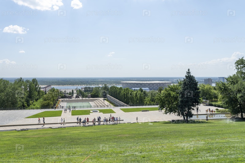 Волгоград, Россия, 22 июля 2020 г., Памятник комплексу Мамаев курган, Памятник СТОЯТЬ НА СМЕРТЬ! вид сзади на долину реки Волги