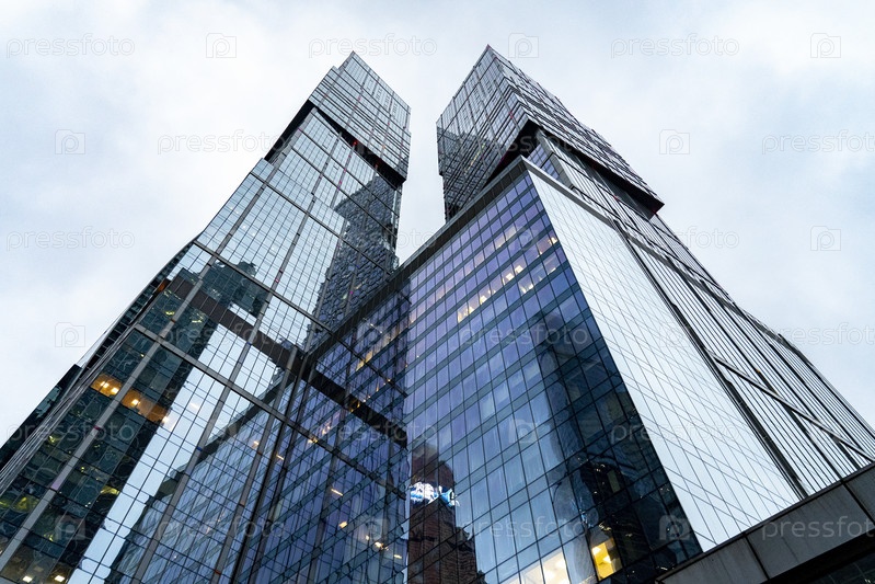 Москва, Россия, 30 ноября 2020 г. Высотные здания в Москве, Московский международный деловой центр (город Москва). Съемка в сумерках, выборочный фокус, разноцветные огни и блики