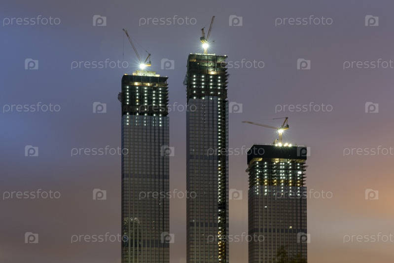Москва, Россия 30 ноября 2020 г. Строительство высотных зданий в Москве, Московский международный деловой центр (г. Москва). съемка в сумерках, выборочный фокус