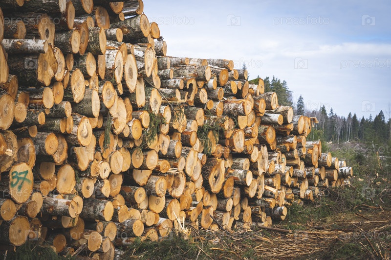 Свежеспиленные сосновые бревна на лесопилке. Большой стек стволов деревьев на лесопилке. Переработка древесного материала на складе деревянных конструкций. Нарубленные пни для дров. Лесное хозяйство