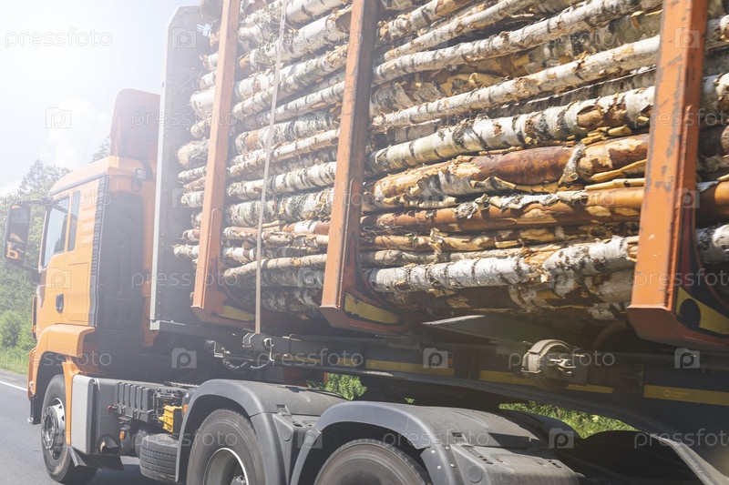 Фура перевозит лес по трассе экспорт импорт и доставка древесины вид сзади, перевозка древесины с сосна ель кедр пихта. Солнечные блики, тонированное изображение, выборочная фокусировка