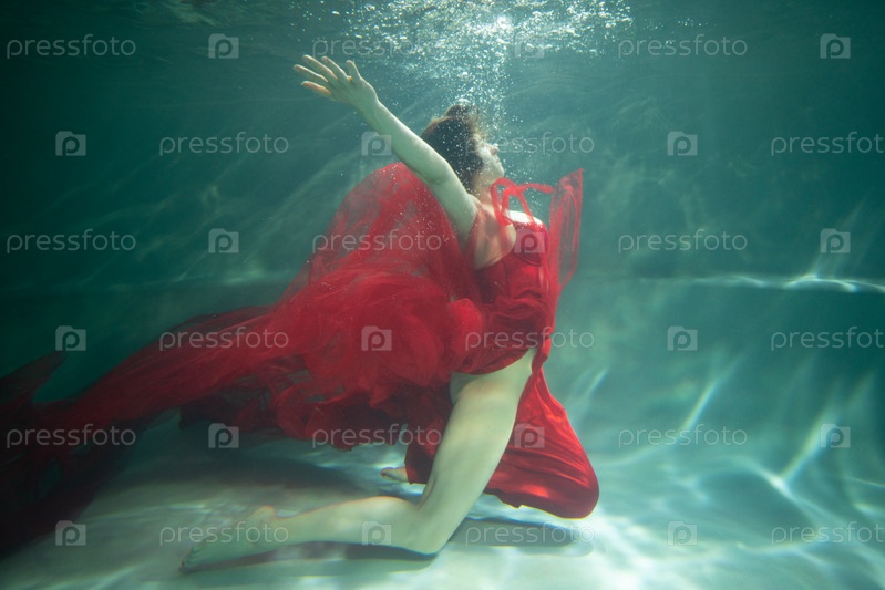 Молодая красивая женщина плавает под водой в красном платье