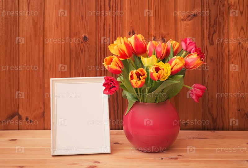 Белая рамка и букет свежих тюльпанов в вазе на деревянном столе