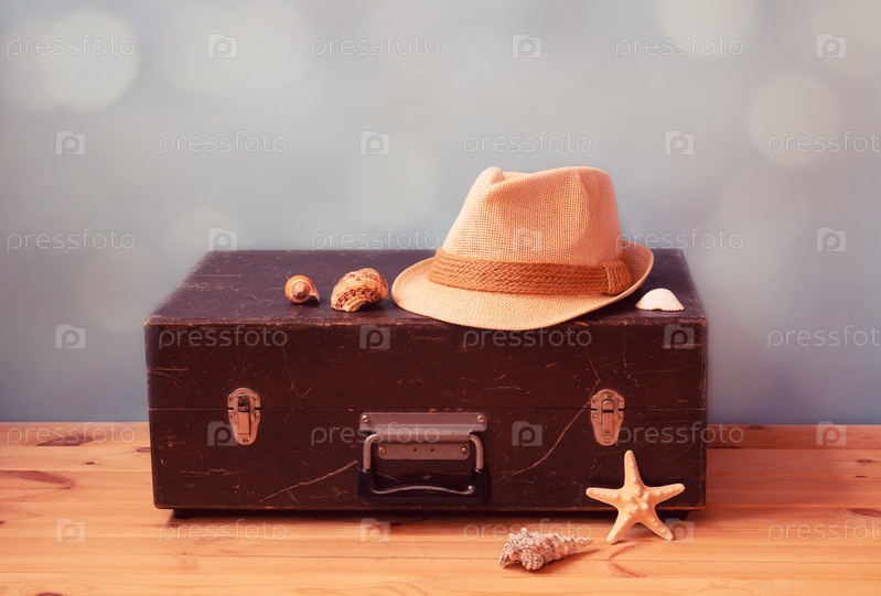 Винтажный деревянный чемодан, шляпа, морские звезды и ракушки. Летние каникулы и концепция путешествий