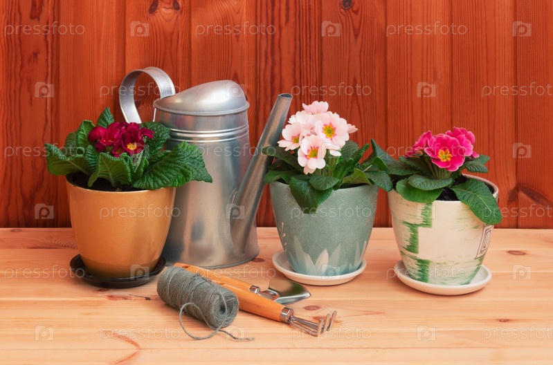 Садовые инструменты и красочные цветы первоцвета на деревянном столе. Выборочный фокус