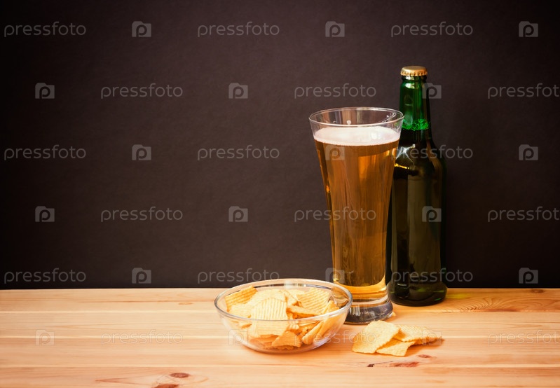 Стакан пива, бутылка пива и картофельные чипсы на деревянном столе на темном фоне. Выборочный фокус